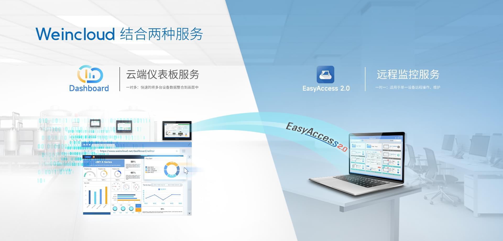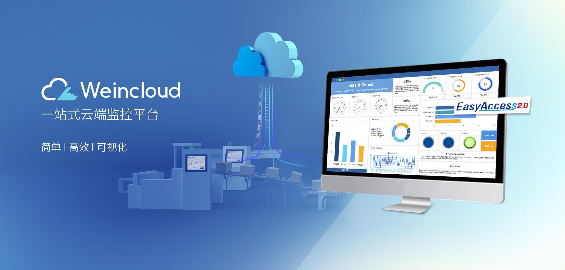 Weincloud 集結EasyAccess2.0遠程監(jiān)控服務及Dashboard云端儀表服務,將設備資料數(shù)據(jù)上云并以視覺化呈現(xiàn),協(xié)助管理者實時掌控現(xiàn)場產(chǎn)線狀態(tài)。